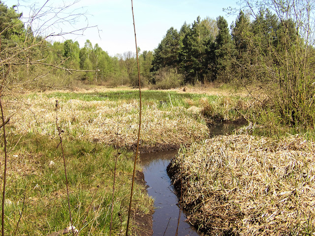 Cóż, droga była lepsza niż jej cel. Udało się nam dotrzeć nad pierwszy staw. Okazał się mocno zarośnięty, wody w nim niewiele. To raczej mokra plama wśród traw i powalonych drzew. Do drugiego nie daliśmy rady się przedrzeć.