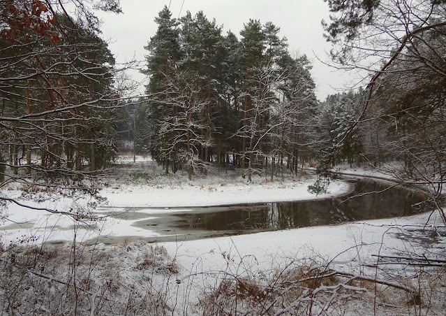I ona malowniczo się wije. Woda widocznie głębsza, bo prawie czarna się wydaje w kontraście ze śniegiem. Koledzy schwytali ją w obiektyw na otwartej przestrzeni na skraju lasu i niegdysiejszych łąk.