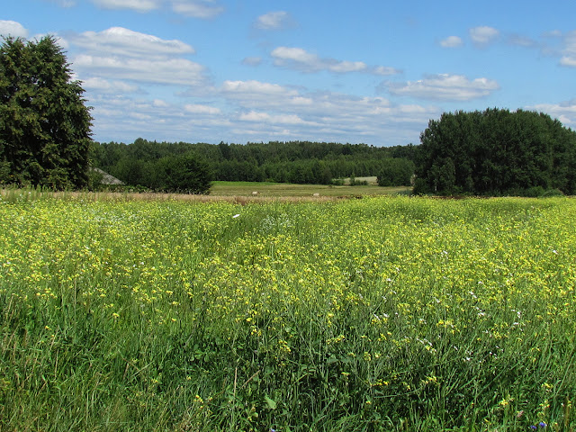 I to był półmetek naszej wędrówki. Zaczynamy odwrót. Rzecz jasna innymi drogami. Kierujemy się na południowy wschód w stronę lasu, mijamy zadbane ogródki przydomowe i kwitnące na żółto łąki.